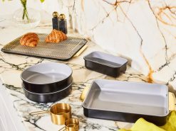 Gjør sunnere baking til et kakestykke med våre keramikkbelagte bakekar. bakewaresettet vårt inneholder 11 deler, alle med en giftfri keramisk overflate, slik at du kan komme til bakevarer uten noe av det dårlige. sett inkluderer oppbevaringsorganer for å holde kjøkkenet ditt ryddig.