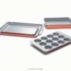Møt karve sitt 5-delers keramikkbelagte bakewaresett som er fritt for giftige kjemikalier. dette settet inkluderer 2 bakeplater, en muffinsform, rektangelform og skaptilbehør.