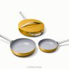 vår 4-delers keramikkbelagte pannetrio gjør det mulig for sunn matlaging på kjøkkenet uten skadelige kjemikalier: bruk for egg som kan trekkes av pannen, steking av grønnsaker og mer. Denne trioen har et giftfritt keramikkbelagt interiør, og gjør matlaging enklere enn noen gang, renhold (tør vi si det) fornøyelig og tilfører et fargerikt inntrykk til ethvert hjem.
