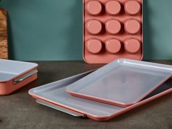 nødvendige bakevarer for ethvert kjøkken, møt bakepapirduoen – en ovnsklar sammenkobling av våre 18×13″ store og 15×10″ mellomstore bakeplater. Disse arkene har et naturlig glatt, ikke-giftig keramisk belagt interiør, og gjør sunn baking (og rydde opp) enklere enn noen gang.
